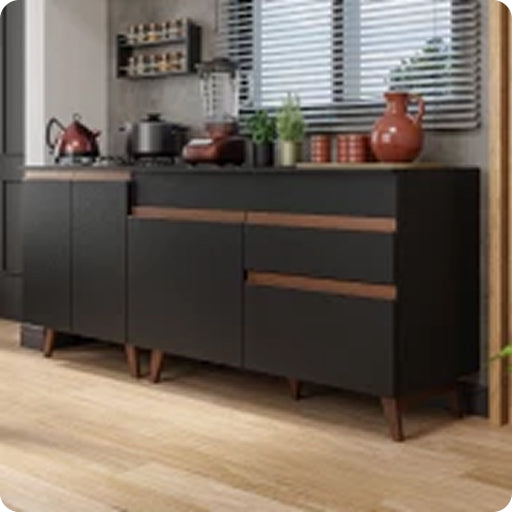 A cozinha queridinha da Madesa é ideal para quem gosta de design moderno! Seus pés de madeira maciça são os principais responsáveis pelo charme da linha, que proporcionam ainda mais firmeza aos móveis.