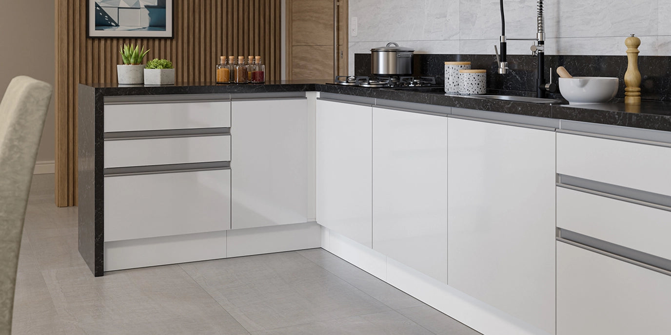 Pés reguláveis e rodapés removíveis de fácil encaixe, facilitando a limpeza e manutenção do seu espaço